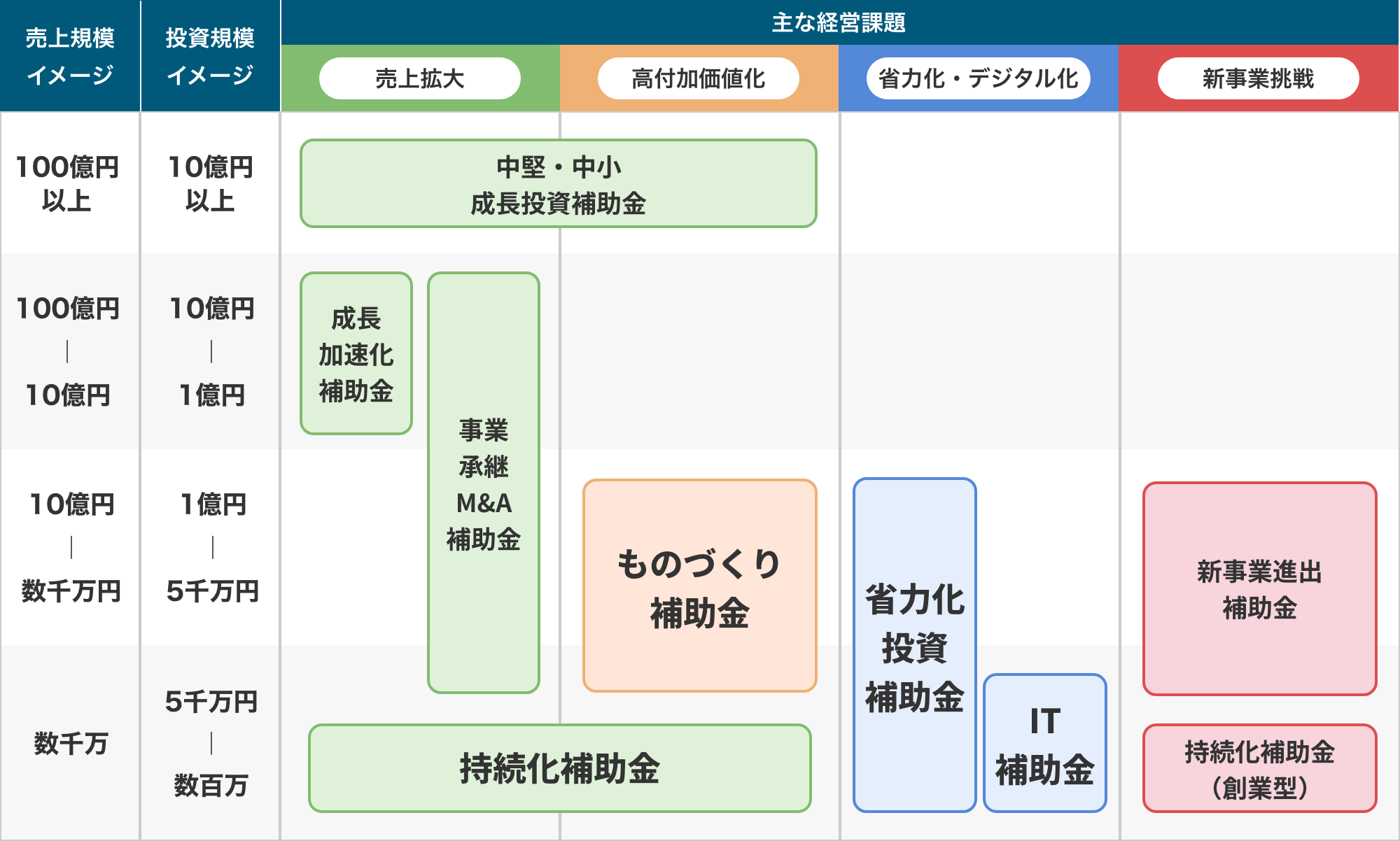 補助金には「新事業進出補助金」、「ものづくり補助金」、「省力化補助金」…など、
