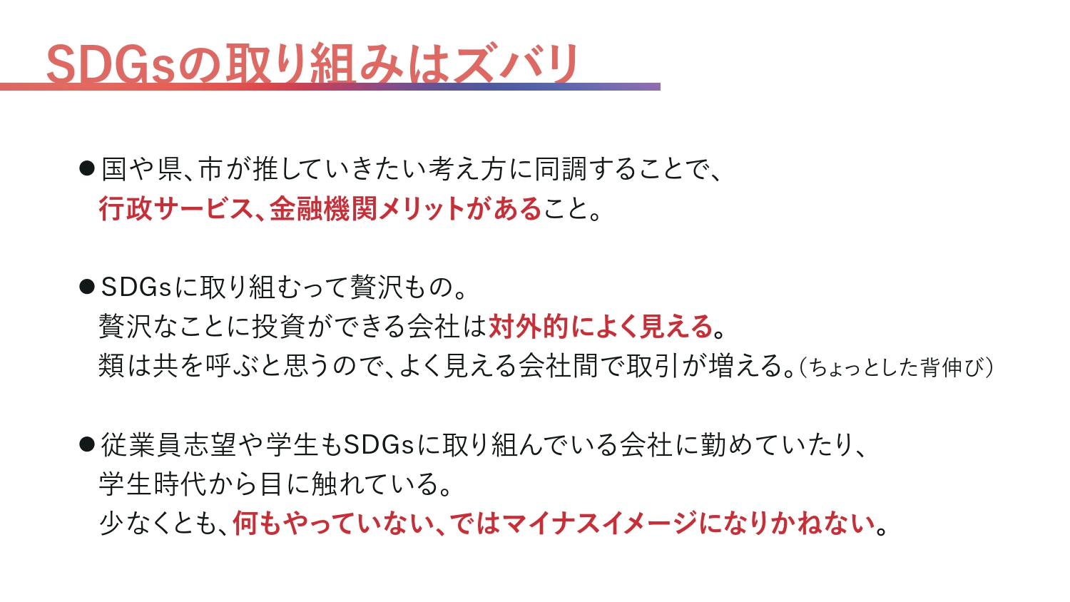 「自社なりのSDGs始めて、県のお墨付きもらってちゃんと告知しようぜ」です。
